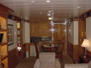 Here are some photos of a Cat 3 suite. Like Cats. 1 and 2, it includes concierge service. This one is a handicapped stateroom, so the bathrooms are a little larger than usual: