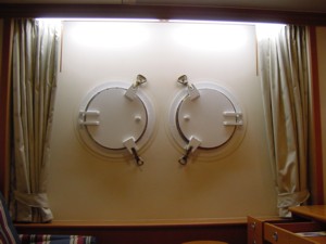 Most people think of a porthole as one large, round opening, and this is true in the staterooms on all decks, down to and including deck 2. But on deck 1, you get two smaller portholes. Here are photos for comparison:
