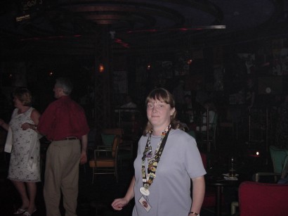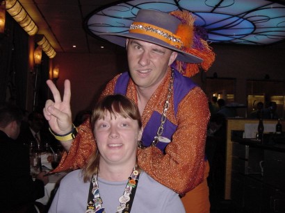 | Sasha from the Cruise Staff drums up excitement for the 70s party at dinner. |