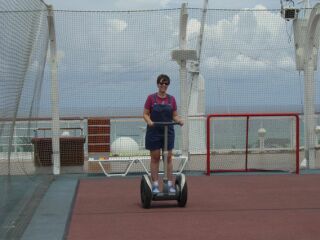 Disney was one of the first to offer ride rentals on "IT". On port days, sea days if the seas were not rough, you could ride it on the sports deck. (Photos "Courtesy of RickW and DanicaW"). When the ship docks at Castaway Cay, DCL has a larger pen set up on the island. The cost was $15 for 15 minutes when we rode in Sept. 2002. It is great fun to ride, the forward/reverse and speed/brakes are controlled with your toes. With the exception of the turning knob on the one handle, the stick has no function.