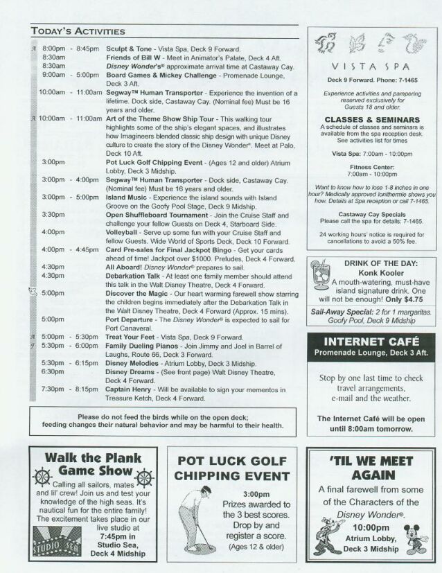 What can you do on Disney's 3-day cruise? From our 8/28/2003 cruise. They are in JPEG format and may not be readable on all monitors. Enjoy! NOTE: There are four pages for each day. Also, keep in mind that this is meant to be a SAMPLE of what MAY be going on during your cruise...Disney changes the times and activities frequently, so it is likely that your cruise will be somewhat different.