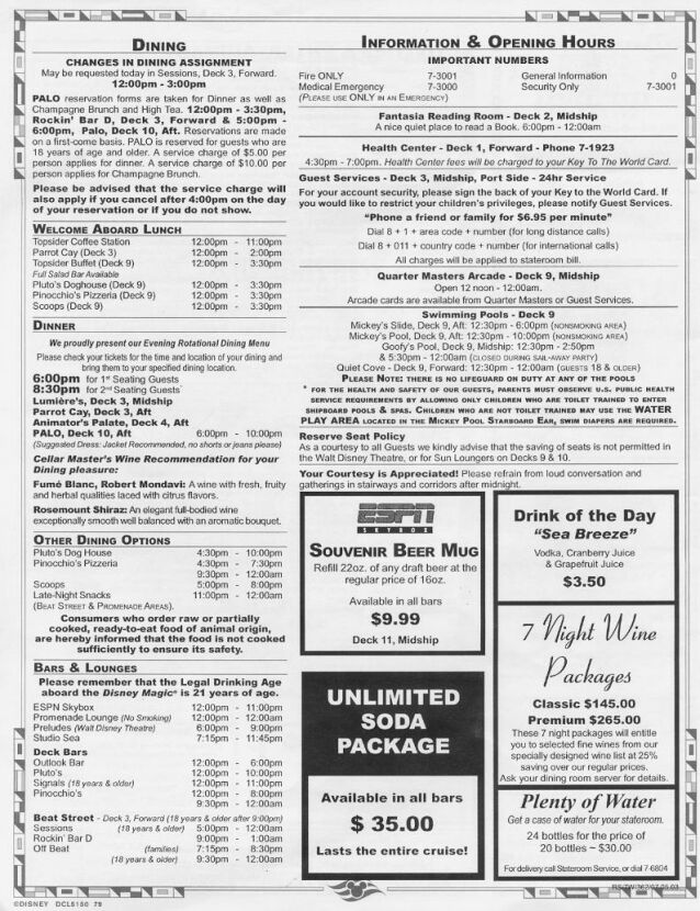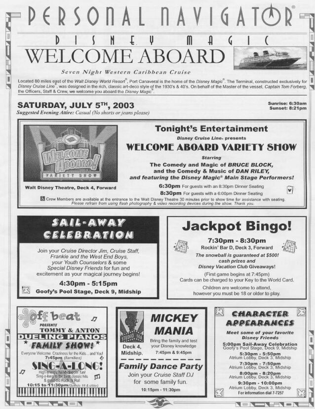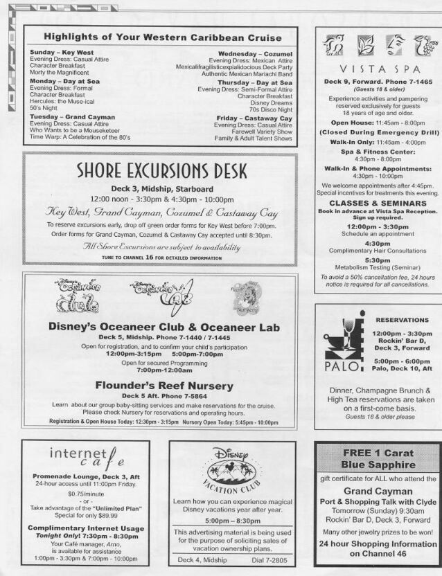 What can you do on Disney's new Western 7-day cruise? Courtesy of "The Canetti Family from New York" 7/5/2003 Western cruise. They are in JPEG format and may not be readable on all monitors. Enjoy! NOTE: There are four pages for each day. Also, keep in mind that this is meant to be a SAMPLE of what MAY be going on during your cruise...Disney changes the times and activities frequently, so it is likely that your cruise will be somewhat different.