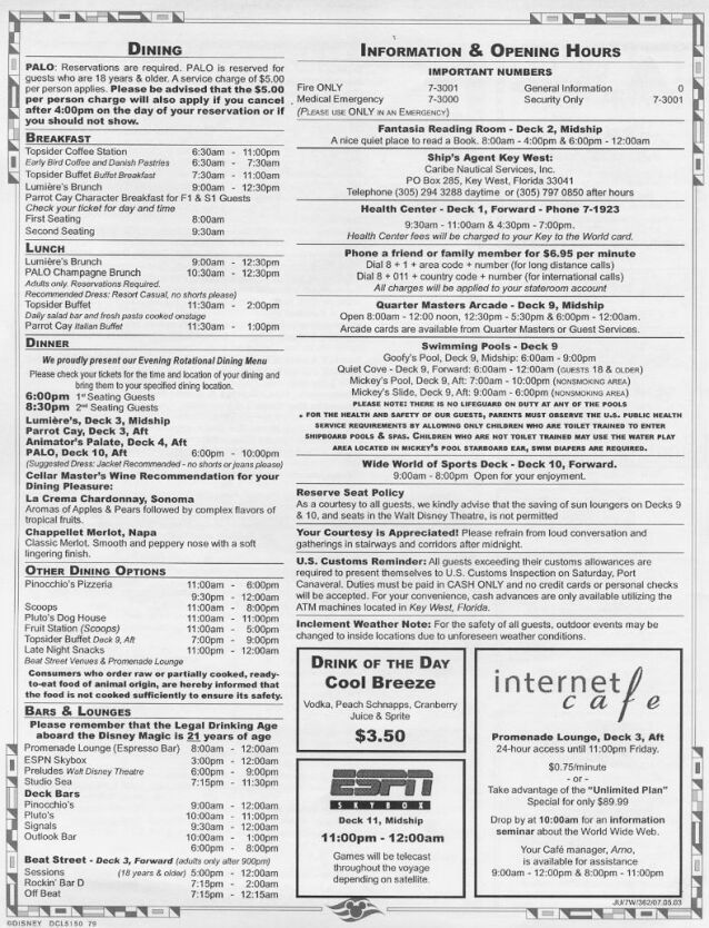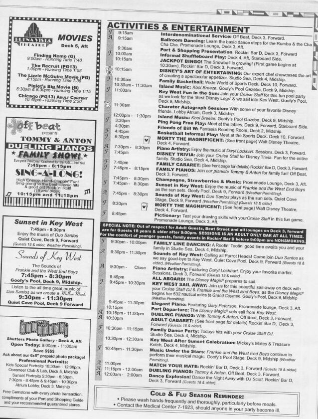 What can you do on Disney's new Western 7-day cruise? Courtesy of "The Canetti Family from New York" 7/5/2003 Western cruise. They are in JPEG format and may not be readable on all monitors. Enjoy! NOTE: There are four pages for each day. Also, keep in mind that this is meant to be a SAMPLE of what MAY be going on during your cruise...Disney changes the times and activities frequently, so it is likely that your cruise will be somewhat different.
