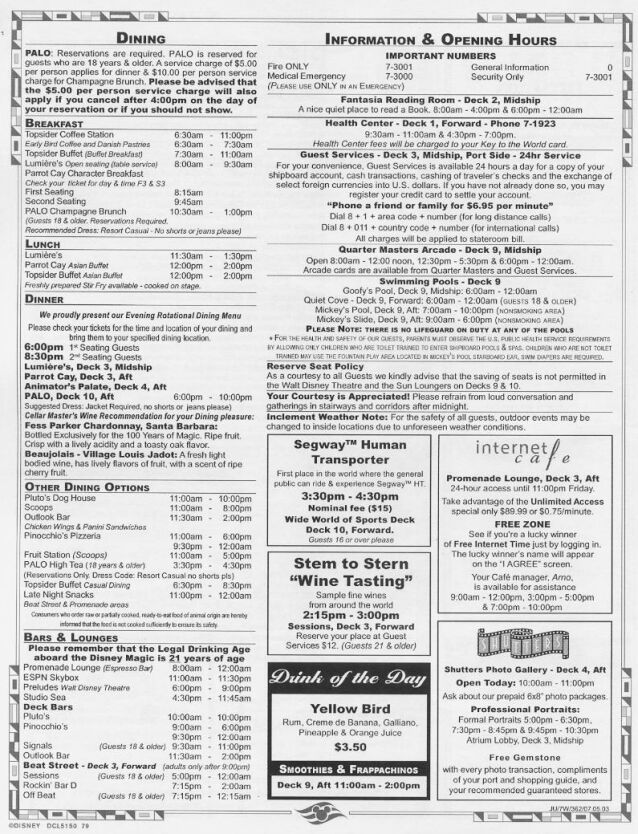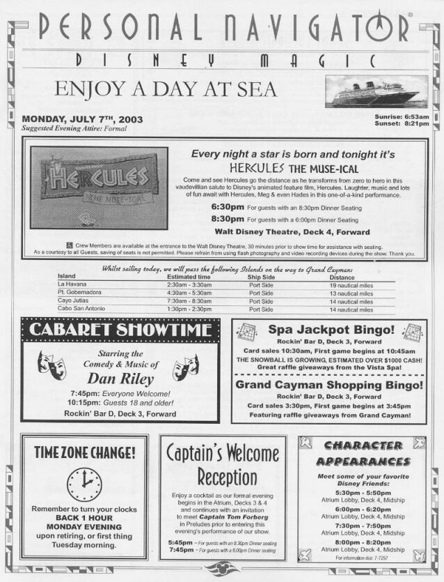 What can you do on Disney's new Western 7-day cruise? Courtesy of "The Canetti Family from New York" 7/5/2003 Western cruise. They are in JPEG format and may not be readable on all monitors. Enjoy! NOTE: There are four pages for each day. Also, keep in mind that this is meant to be a SAMPLE of what MAY be going on during your cruise...Disney changes the times and activities frequently, so it is likely that your cruise will be somewhat different.