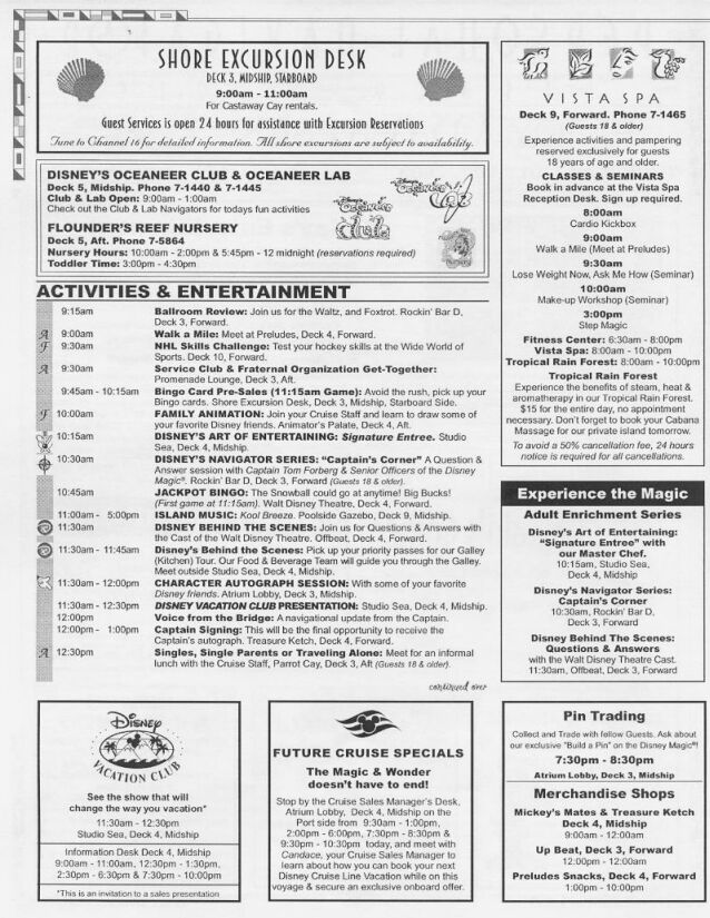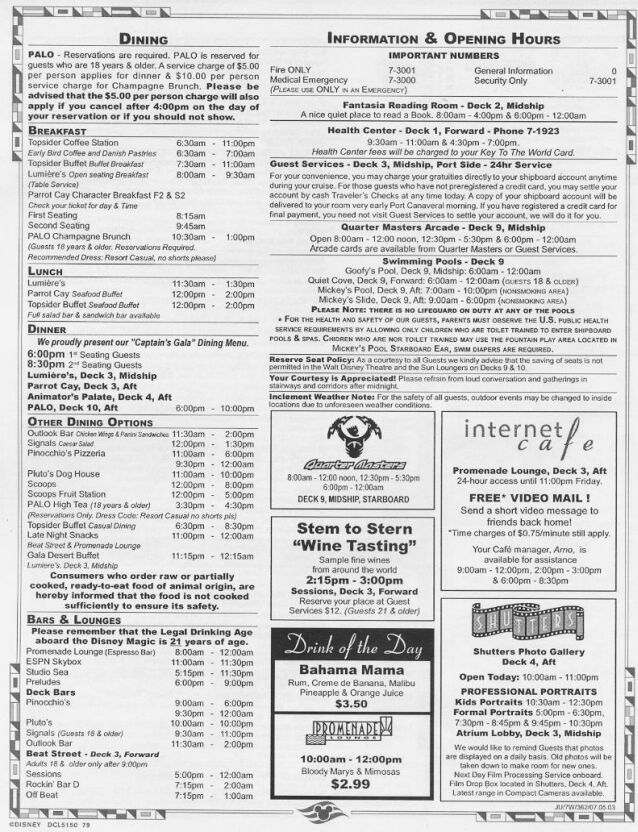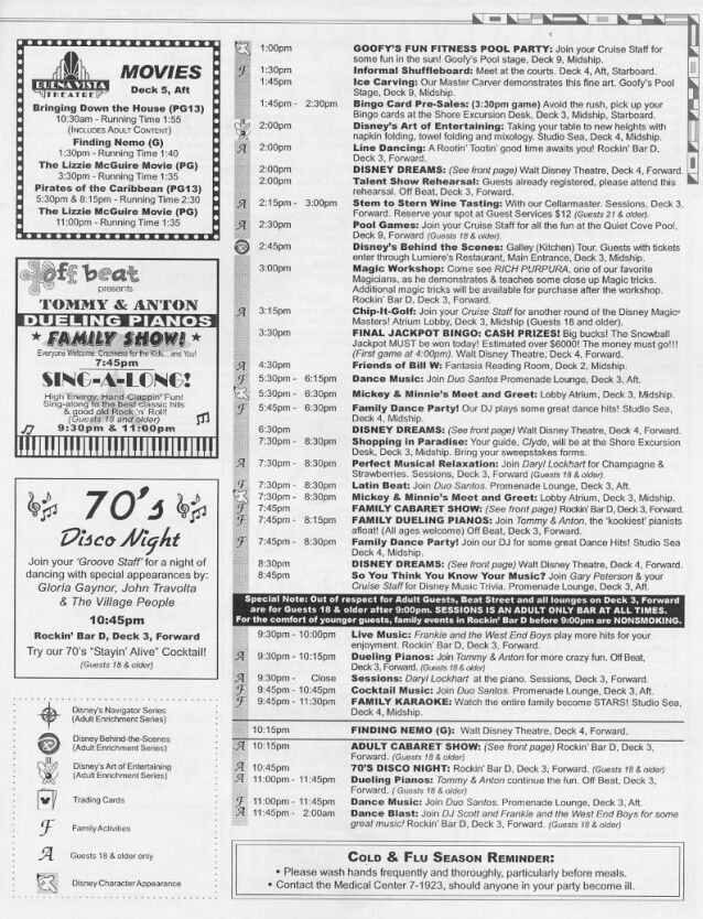 What can you do on Disney's new Western 7-day cruise? Courtesy of "The Canetti Family from New York" 7/5/2003 Western cruise. They are in JPEG format and may not be readable on all monitors. Enjoy! NOTE: There are four pages for each day. Also, keep in mind that this is meant to be a SAMPLE of what MAY be going on during your cruise...Disney changes the times and activities frequently, so it is likely that your cruise will be somewhat different.